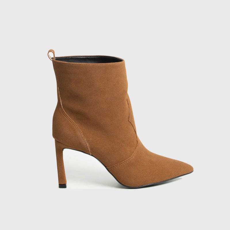 A bota de cano curto com bico fino e salto alto cria um visual marcante e sofisticado na medida certa.