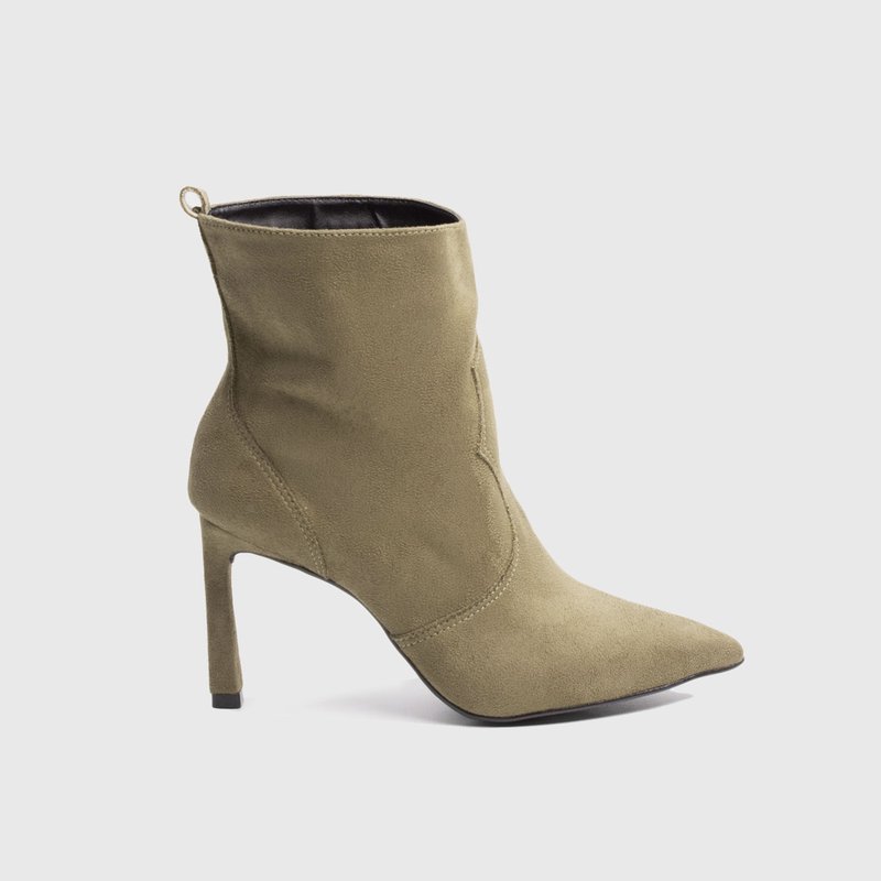 A bota de cano curto com bico fino e salto alto cria um visual marcante e sofisticado na medida certa.
