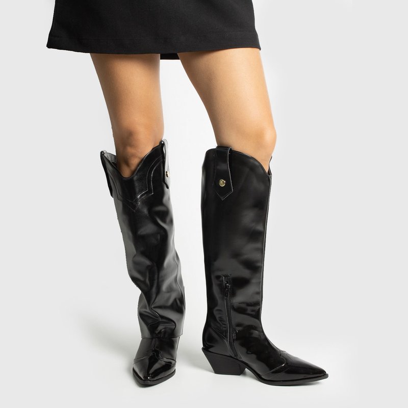 O modelo possui cano longo, salto médio bloco e bico fino, criando uma silhueta elegante e imponente.