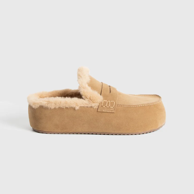 A clog possui interior e acabamento em pelo sintético, proporcionando um toque macio e uma sensação aconchegante ao caminhar.