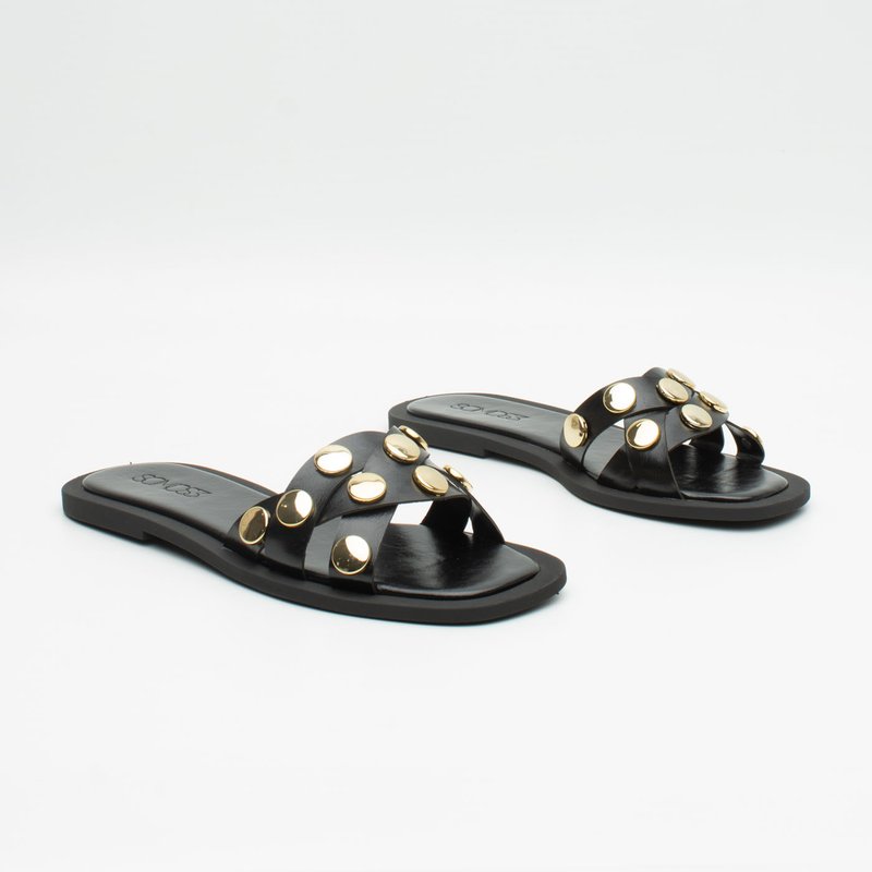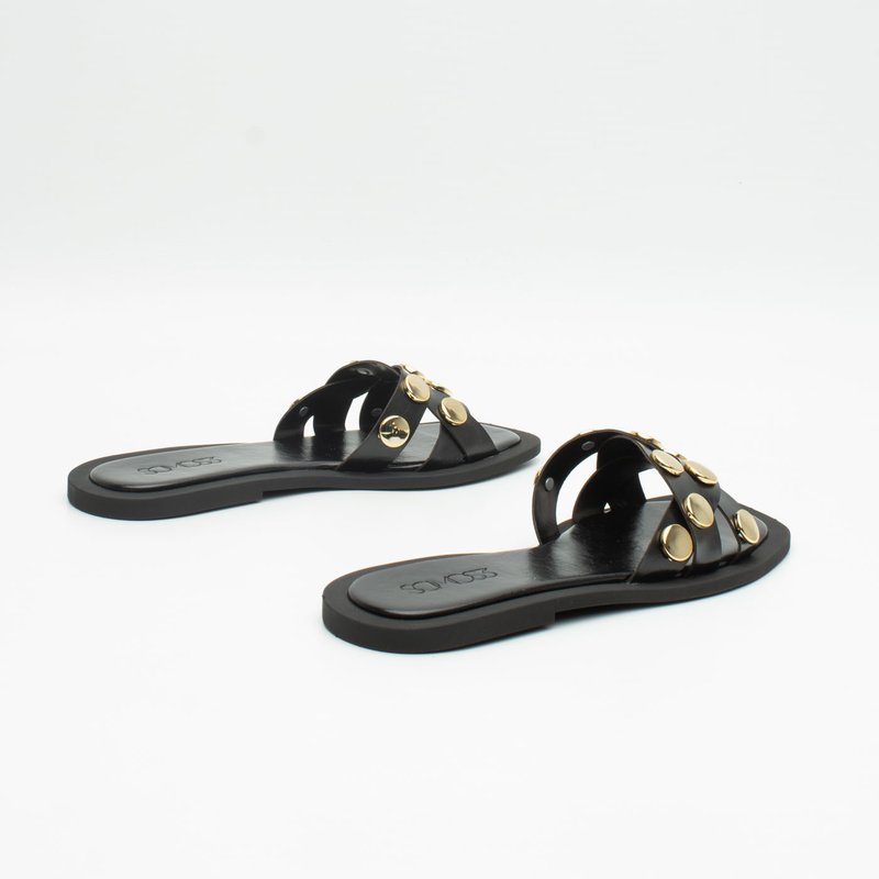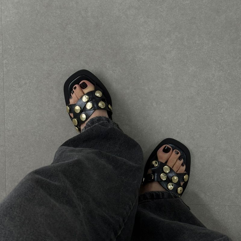 O design slim com tiras cruzadas é super versátil e se adapta a qualquer estilo, enquanto os maxi studs metálicos garantem aquele toque fashionista que eleva até o look mais básico.