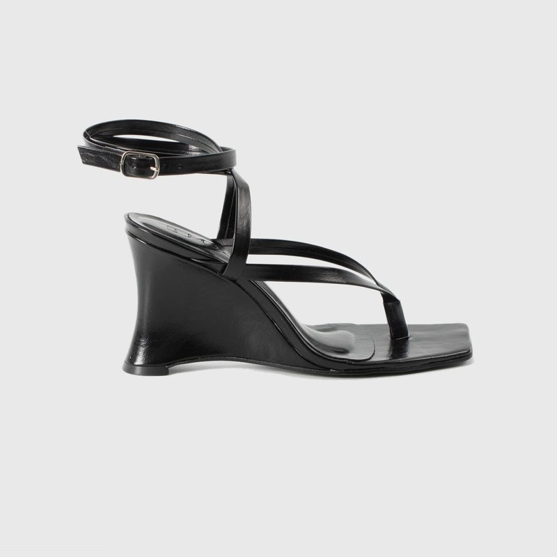 O modelo conta com salto anabela alto de curvatura elegante, bico quadrado e tiras finas que se entrelaçam delicadamente no tornozelo.