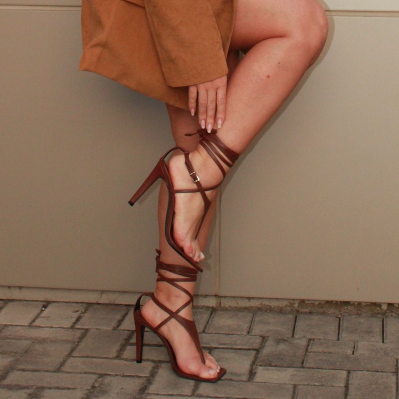 A sandália destaca-se pelas tiras finas em design trançado, que adicionam um toque delicado e elegante ao visual. Sua amarração no tornozelo valoriza as pernas e garante ajuste perfeito,