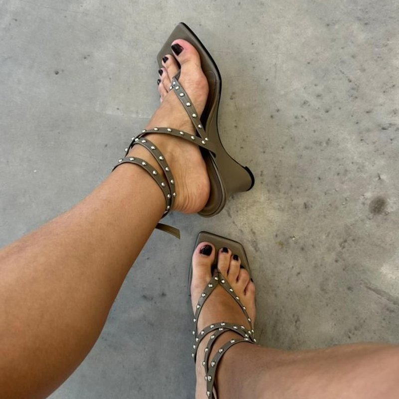 O modelo conta com salto anabela alto de curvatura elegante, bico quadrado e tiras finas que se entrelaçam delicadamente no tornozelo.