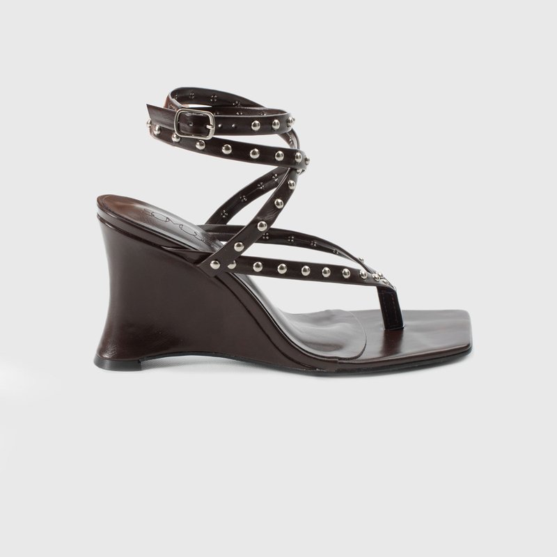 O modelo conta com salto anabela alto de curvatura elegante, bico quadrado e tiras finas que se entrelaçam delicadamente no tornozelo.