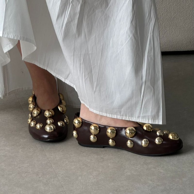 Confeccionada em napa marrom macia, ela combina o clássico com um visual moderno e cheio de personalidade. O detalhe das tachas grandes douradas traz um ar fashionista, enquanto o design flat garante conforto absoluto para o dia a dia.