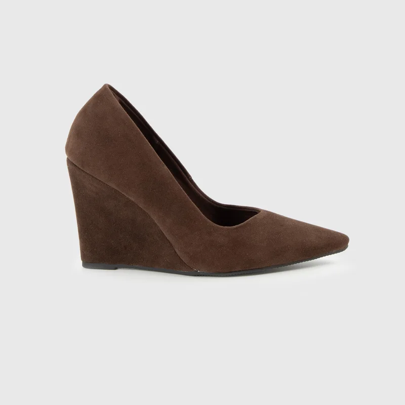 O modelo apresenta salto alto anabela e bico fino, trazendo uma proposta sofisticada com toque moderno.