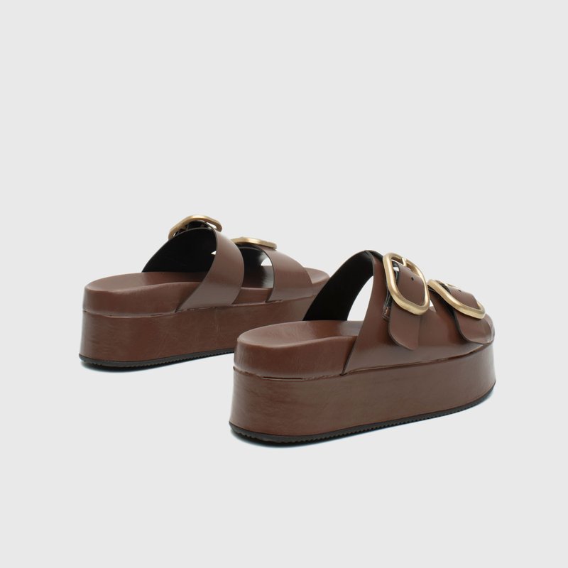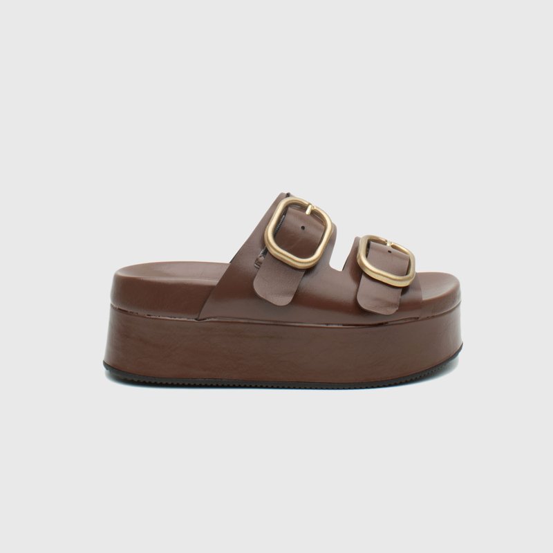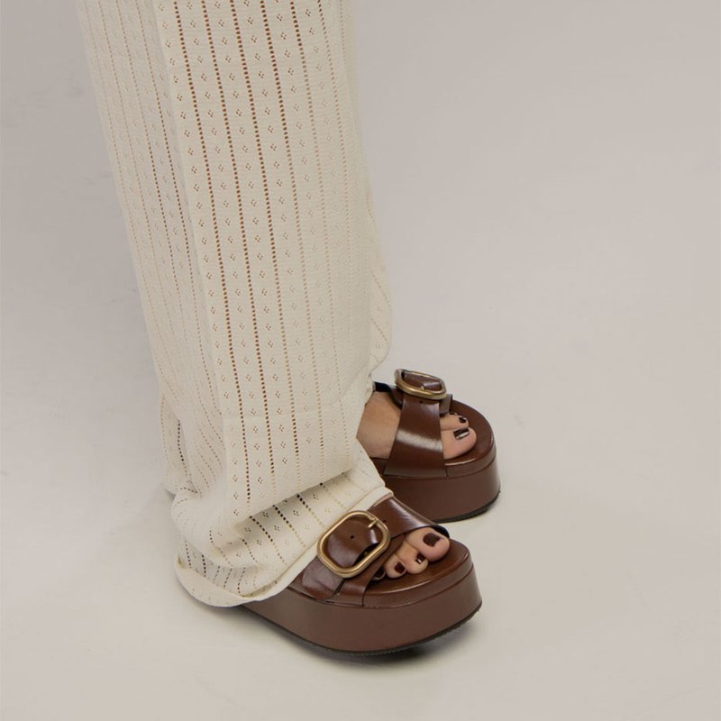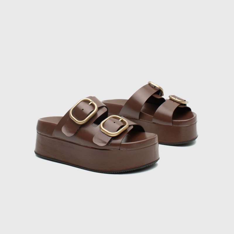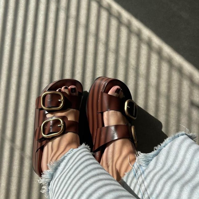 As duas maxi fivelas douradas elevam o design com um ar fashionista, enquanto a base alta e reta garante conforto e presença.
